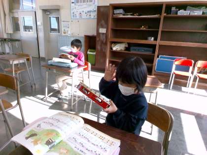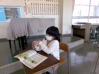 曲に合わせて楽器を鳴らしています。繰り返しに気を付けながら、リズムよく演奏しました。