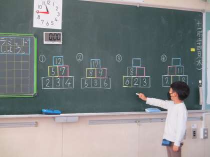 計算ピラミッドに挑戦しています。どこから計算したらよいか、友達に分かりやすく説明しました。