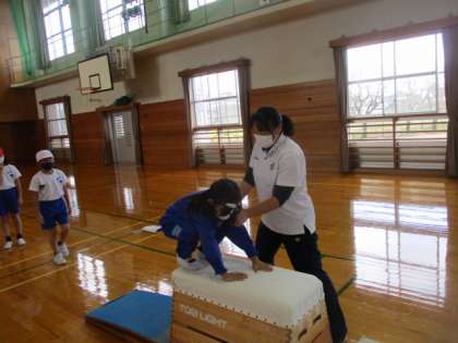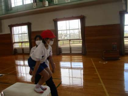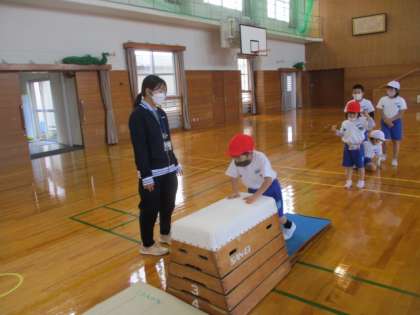 スポーツ指導員の方と跳び箱あそびをしました。踏み切り板で助走の練習をしたり、開脚跳びにつながるあそびをしたりしました。これから行う跳び箱あそびに生かしていきたいですね。