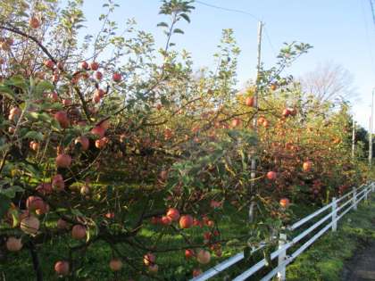 今朝は、まぶしい光の中の登校となりました。りんごも朝日で輝いて見えます。