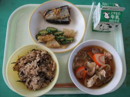 今日のメニューは、ひじきご飯、さんまのしょうが味、華風和え、かしわうどん、牛乳でした。ごま油やしょうがが全体の味を引き立ていて、おいしかったです。