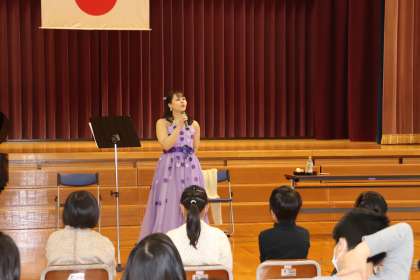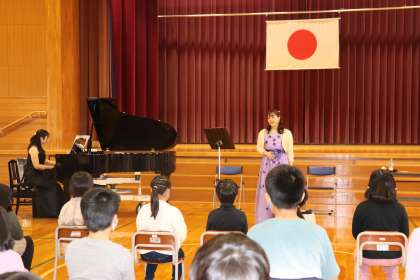 富山市出身のお二人による音楽会でした。声楽(メゾソプラノ)とピアノの音色が体育館に響きました。