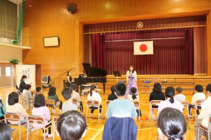 富山市出身のお二人による音楽会でした。声楽(メゾソプラノ)とピアノの音色が体育館に響きました。