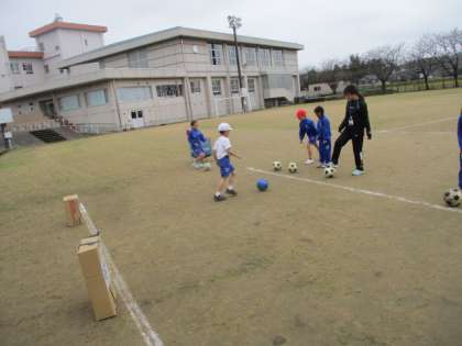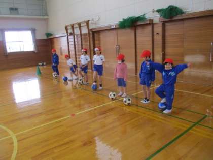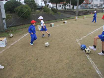 ボールけりの学習で、新しい的が誕生。なかなか倒れない的に向かって夢中にボールを蹴っている姿が見られました。