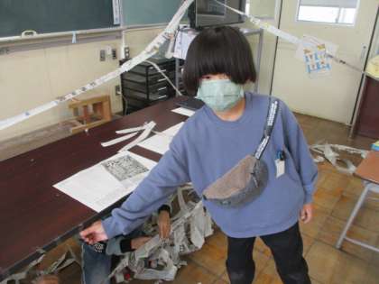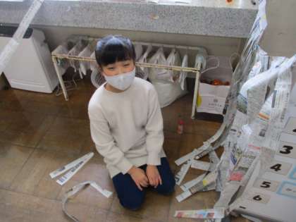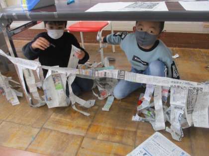 新聞紙をつないで、さまざまなコーナーをつくりました。温泉ののれんをつくったり、トンネルをつくったりしました。子供たちの発想に驚かされました。