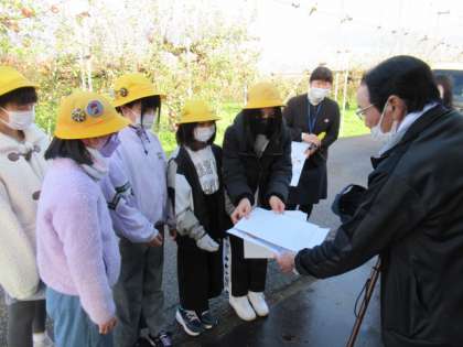 「加工品チーム」は、地域のりんご農家さんに自分たちがデザインしたシールやチラシをもっていきました。自分たちが作ったシールをりんご農家さんと一緒に貼り、池多りんごを広める活動を共にしました。