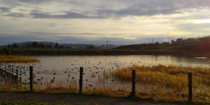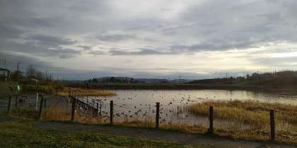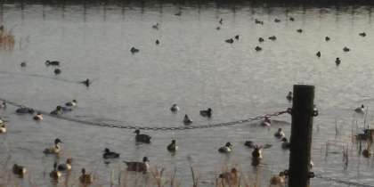 白鳥が飛来する季節となりました。午前7時30分ごろ、白鳥はいませんでした。カモたちがのんびり浮かんでいました。