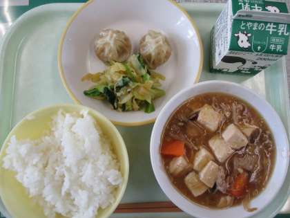 今日の給食は、ごはん、豆腐ときのこのあんかけ煮、ショウロンポウ、チンゲイサイひさし、牛乳でした。あんかけ煮のあんの味が豆腐にしみこみ美味しかったです。