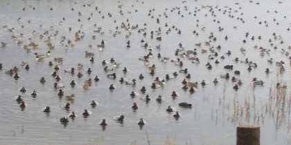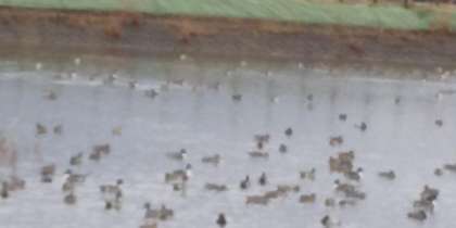 午前7時20分現在、白鳥は既に飛び立ったあとでした。白鳥愛護会の方によると、7羽の白鳥がいたそうです。田尻池では、カモたちがにぎやかに合図をおくり合っているようでした。