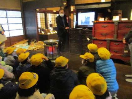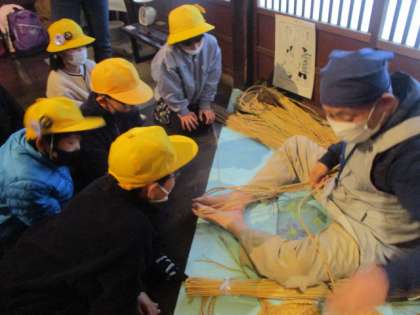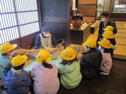 民俗民芸村では、昔のくらしについて学びました。まずは、写真で振り返りました。そして、所蔵してある昔の道具を一つ一つ見て回りました。特に、実際に見せていただいたわらじの編み方に、子供たちは身を乗り出して見つめていました。