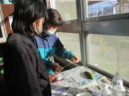光電池に電子オルゴールをつなぎ、日光を当ててみました。日光の当て方により、オルゴールの音がなり、発電することを確かめました。