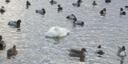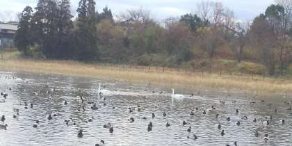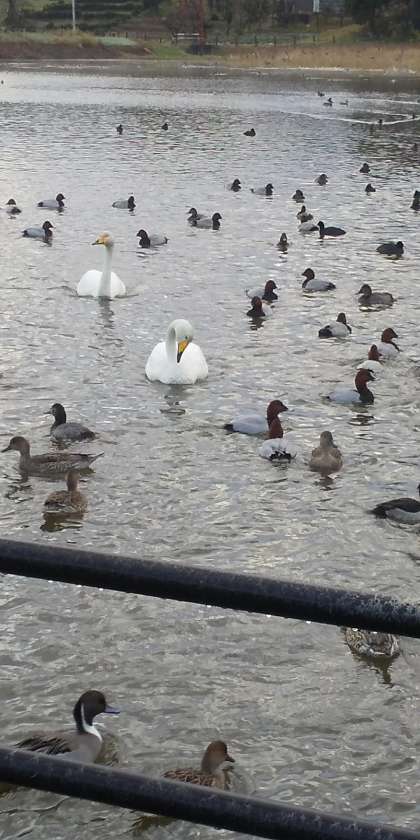 2羽の白鳥がゆったりしていましたが、少しずつ遠くの方へ泳いでいきます。