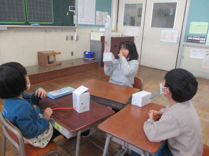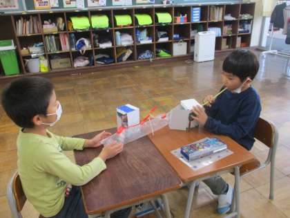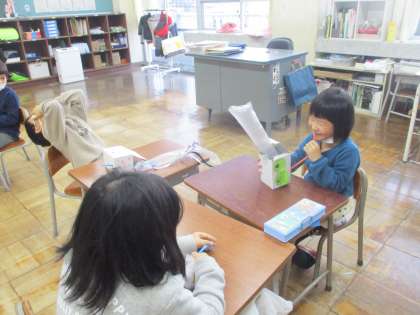 作った作品を友達と見せ合っています。「かざりがすごいね」「絵がじょうずだね」とお互いによいと思ったところを伝え合いました。