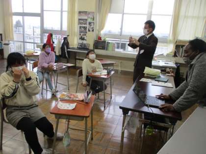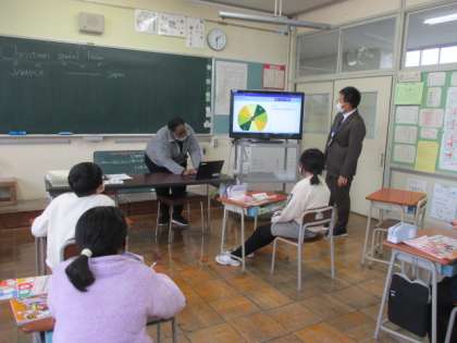 今日は特別レッスン。2チームに分かれて、示された図からクリスマスに関する言葉を素早く言い当てます。時々難しい言葉もあり、なんと発音すればよいのかALTの先生に教えてもらう場面もありました。