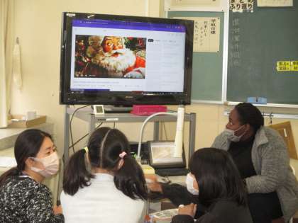 ALTの先生が、クリスマスにちなんだ言葉を教えてくださったり、クリスマスワードビンゴを用意してくださったりしました。子供たちは、目を輝かせながらチャレンジしていました。