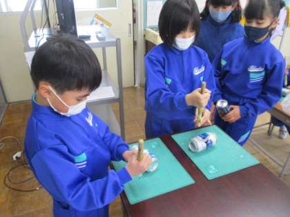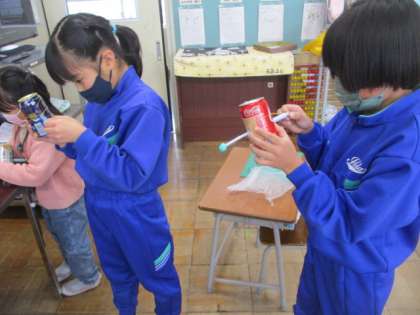 今日は空き缶アーチェリーづくりをしました。空き缶やストロー、輪ゴム等、身近にあるものを使って作りました。その後、的当てをして遊びました。