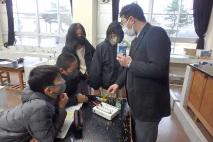 電球とLEDのよさを話し合ったり、比べたりしながら、電気の大切さを感じることができました。教頭先生のお話や実験キットに興味津々の6年生でした。