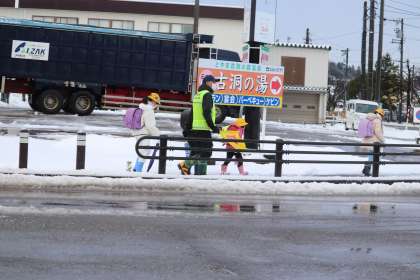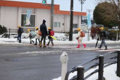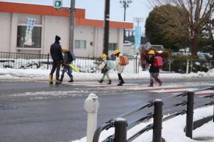 かなり冷え込んだ朝ですが、子供たちは雪道に気を付けながら慎重に歩いています。