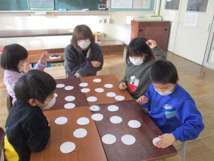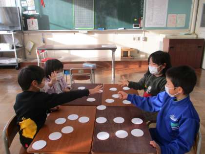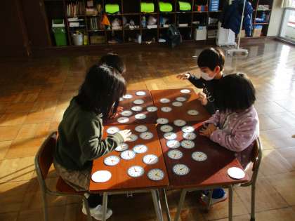 今までの学習の復習をしています。今日は、時計の確認をしました。時計カードでカルタをしたり、神経衰弱をしたりしました。保健室の先生を誘って盛り上がりました。