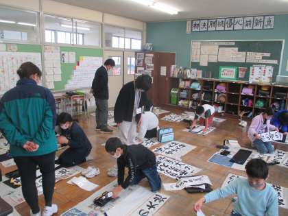 書き初めの練習をしました。のびのびと、力強い字を書くようになってきた子供たち。今日は、担任の他、教務の先生、図書館司書の先生にも来ていただいて、一人一人細かいところまで教えていただきました。腕をめきめきと上げていく子供たち。先生方からいただいたアドバイスを冬休みの家庭での練習に活かしてほしいです。今から、書き初め大会が楽しみです。