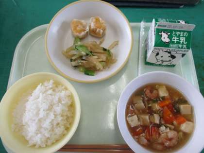 2学期最後のメニューは、ご飯、にんじんシューマイ、大根ナムル、えびと豆腐のうま煮、牛乳でした。毎日みんなで味わっていただきました。3学期には、給食週間もあります。楽しみにしてくださいね。