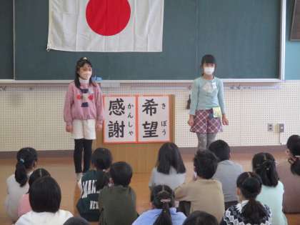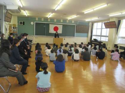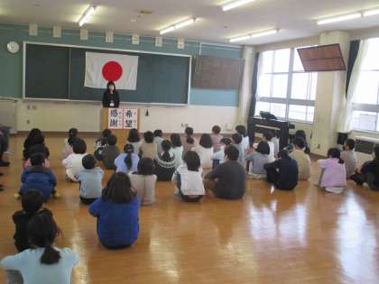 雪が降り、寒い朝になりました。今日は、視聴覚室で暖かくして2学期の終業式を行いました。校長先生から、2学期に「挑戦」してきたことや、新年を迎えるにあたり「希望」と「感謝」の気持ちを大切にしましょうと、お話がありました。最後に、子供たちの代表が2学期にがんばったことの発表をしました。