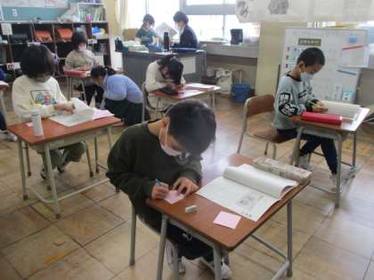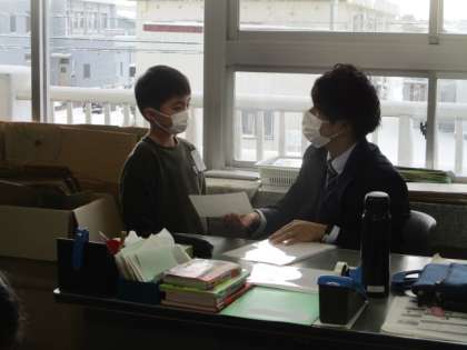担任の先生から、2学期のがんばりをほめてもらっていました。みんなは友達の作品にメッセージを書いています。