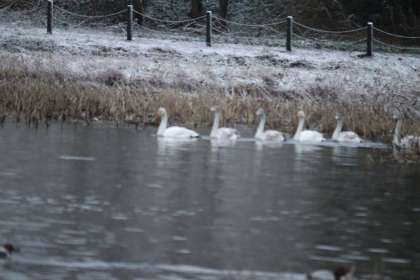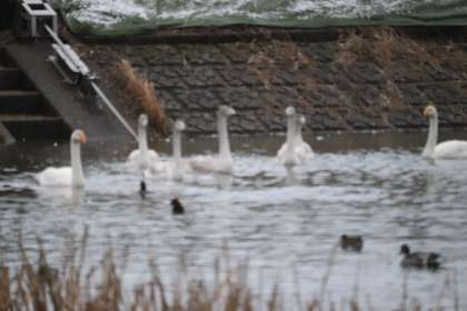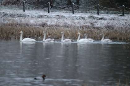 茂みの方から白鳥たちが1列になって、出てきました。飛び立つのかと待っていましたが、飛び立ちません。風が吹くと飛び立ちやすいと聞きましたが、どうも風は吹いていません。