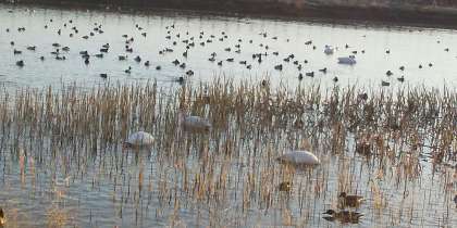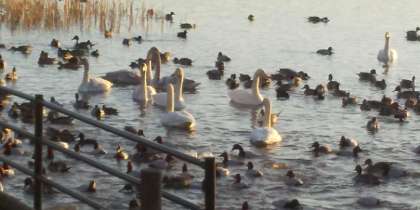 7時30分頃の様子です。50羽の飛来が確認されています。カメラマンの方たちの側に寄っていく白鳥、茂みの方でえさ探しに没頭している白鳥等、それぞれでした。