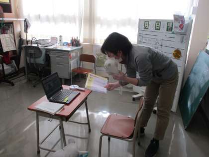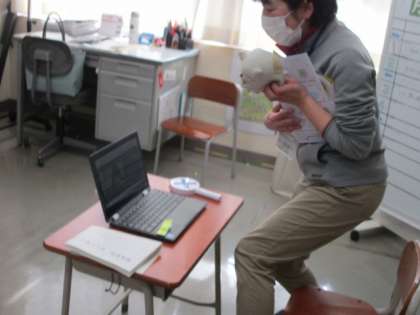 Meetで新しい漢字を学んでいます。声もしっかりと届いています。また、先生のお話に合わせて動かす手の動きもよく見えました。
