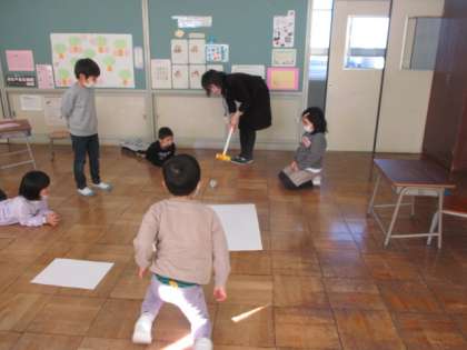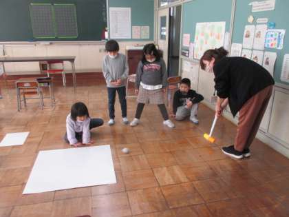 保育所の子供たちのために、ゴルフゲームをつくっていました。校長先生や学校司書の先生を楽しませてくれました。