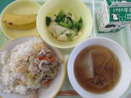 1月13日(金)今日の給食 公開日 2023/01/13 更新日 2023/01/13 池多っ子ゴーゴー 今日のメニューは、麦ご飯、塩だれ豚丼、かぶの彩り、ワンタンスープ、バナナ、牛乳でした。豚丼は、ご飯にぴったりのおいしさです。