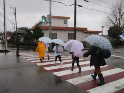 傘をさしているため、子供たちはいつも以上に慎重に歩いています。