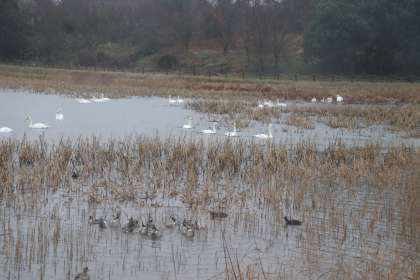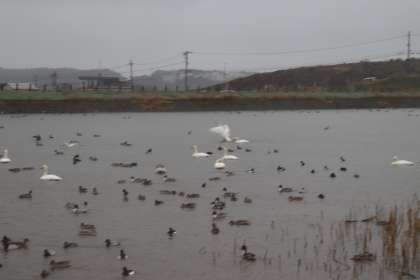 7時10分現在の気温は6度、雨が降っています。48羽の白鳥がいました。一列に連なって移動したり、えさを食べたりしています。