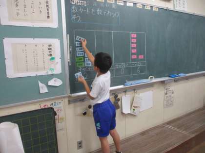 1000より大きい数の学習です。ならんだ数カードはいくつなのかを考えました。くり上がりに気を付けながら数字にすることができました。