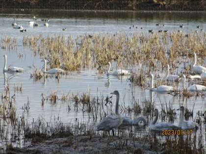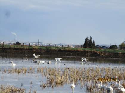 今日の白鳥の飛来数は66羽でした。そのうちの3羽が飛び立っていく姿を見ることができました。今年初めて飛び立つところを見られたので、うれしかったです。