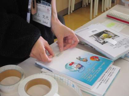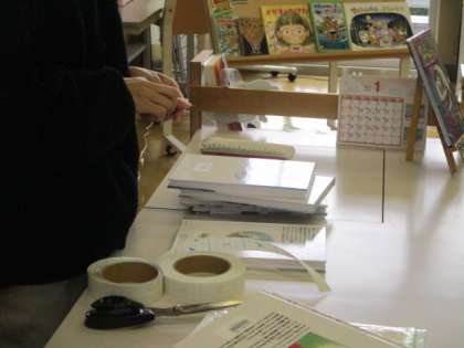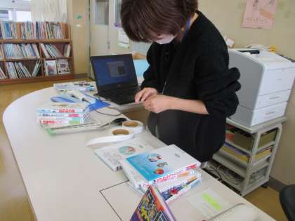学校司書の先生が、新しい本の貸し出し準備を進めています。いろいろな本と出会ってほしいです。ぜひ、手に取ってくださいね。