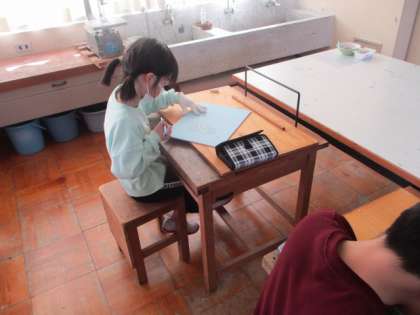 今日も版画の制作を進めました。彫刻刀の扱いにも少しずつ慣れてきたようで、表現したい部分に合わせて、三角刀や丸刀を使い分ける様子も見られるようになりました。片付けもみんなで素早く行いました。安全に楽しく作業ができましたね!