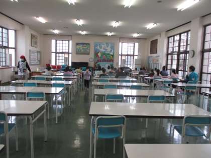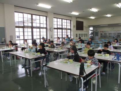 1、2、3年生だけで食べています。スキー学習では、すでに午後の講習が始まっています。