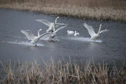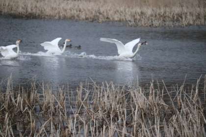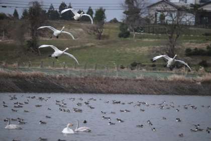 ちょうど白鳥たちが舞いおりてきました。互いに「がんばったね」と言っているかのように、鳴き合っていました。