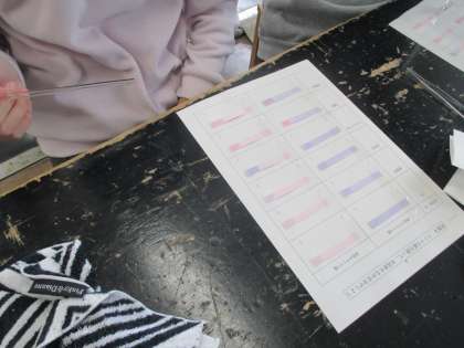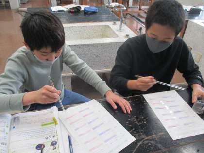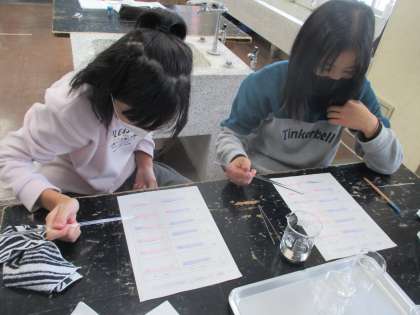リトマス紙を使って、水溶液をなかま分けする実験をしました。赤いリトマス紙が青くなったり、青いリトマス紙が赤くなったりすることに、驚いていました。