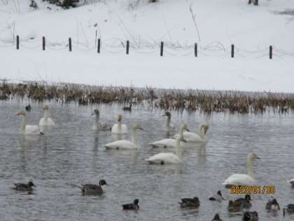 午前9時頃の白鳥の飛来数は35羽でした。白鳥が飛び立つ合図は、一緒に声を合わせて羽を広げることだと来訪者の方から教えていただきました。今度探検隊に行った時には、気を付けて見てみようと思いました。