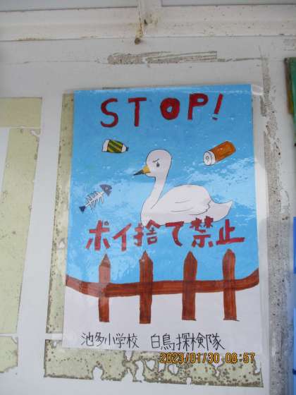 白鳥探検隊の4年生が作成したポスターを貼ってきました。白鳥やカモが住む田尻池の環境をよりよくしたいという思いが込められています。ぜひ見てください。