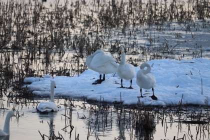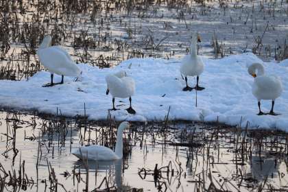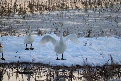昨日と同じで雪の上で休む白鳥たちも見られます。時々羽を広げていました。