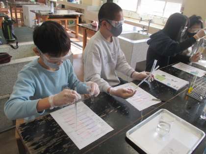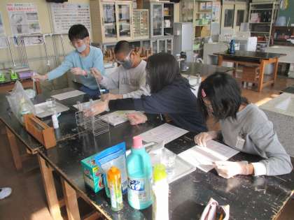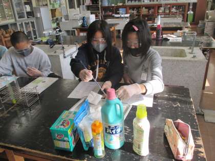 身のまわりにある水溶液の性質について、リトマス紙を使って調べました。洗剤類はアルカリ性のものが多いことや、酢やみかん等が酸性だったことに驚いていました。