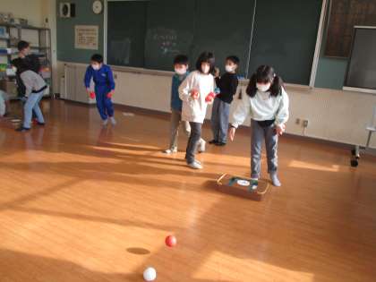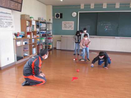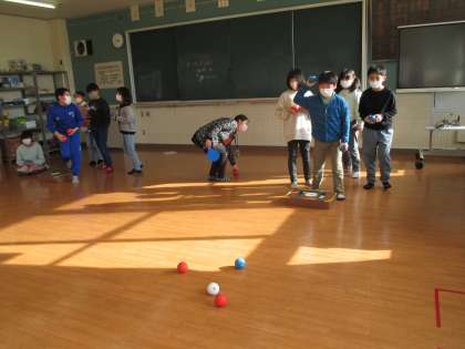 パラリンピック競技の一つの”ボッチャ”を体験しました。カーリングのように、目印となる白玉にできるだけ近くなるように玉を投げたり、転がしたりするスポーツです。子供たちはルールが分かると、夢中になって取り組んでいました。