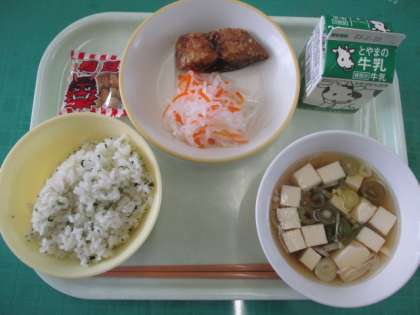 今日のメニューは、菜飯、魚のかば焼き、なます、すまし汁、節分豆、牛乳でした。色鮮やかです。節分の日にぴったりの豆もおいしく食べました。
