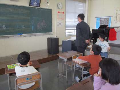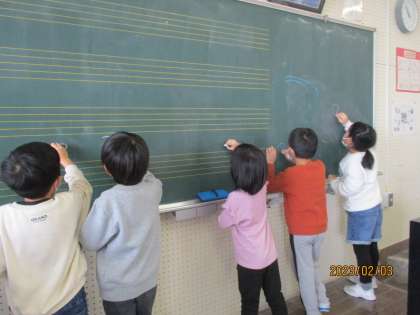 絵描き歌に合わせて、みんなで絵を描いています。スペシャル審査員として、教頭先生に好きなたぬきを選んでもらいました。