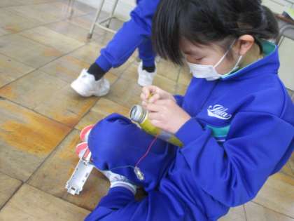 アルミ缶とスチール缶は、電気を通すのか探っています。
