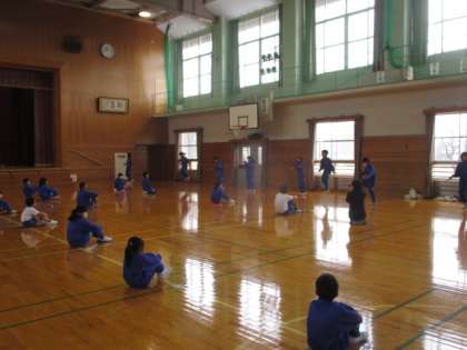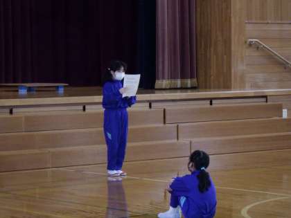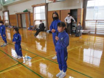 短なわ跳びのスローガンは、「目指せ、ワンランクアップ!〜今の自分を跳び越えよう〜」健康委員会委員長が全校一人一人に、挑戦する技の名前を聞きました。全員が、一生懸命に練習の成果を発揮して、技を発表しました。